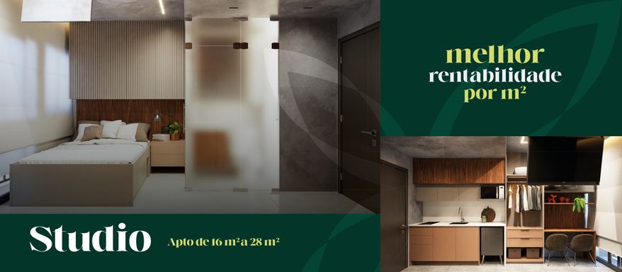 Studios modernos ideais para locação por temporada e curta estadia, um dos formatos que mais cresce no mercado imobiliário turístico.
