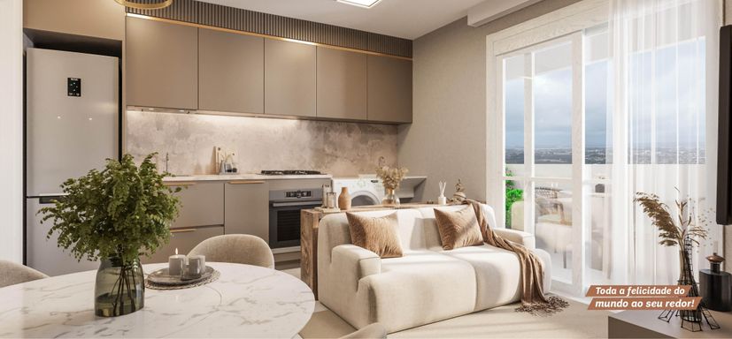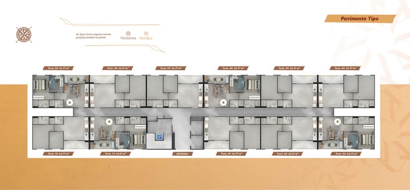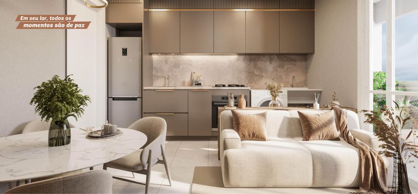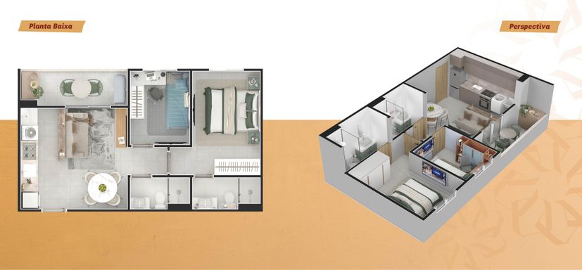 Unidades com aproximadamente 45 m² de área privativa, distribuídas em: