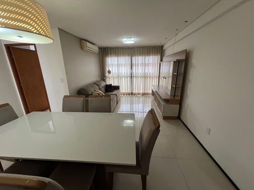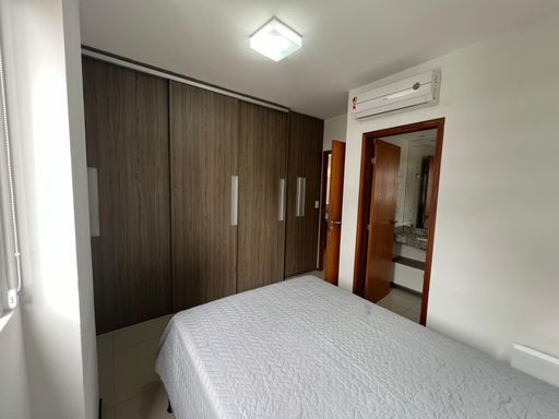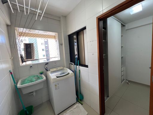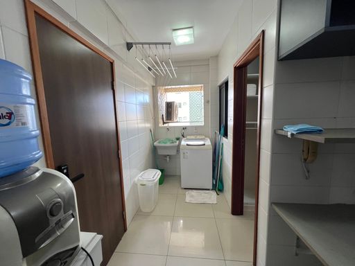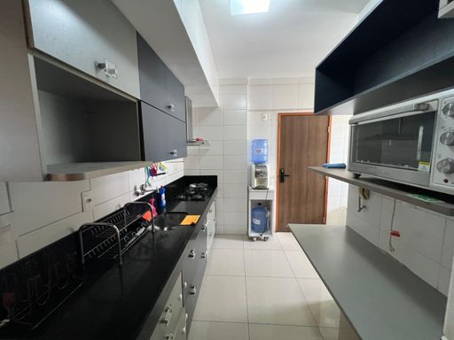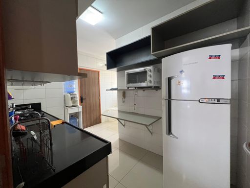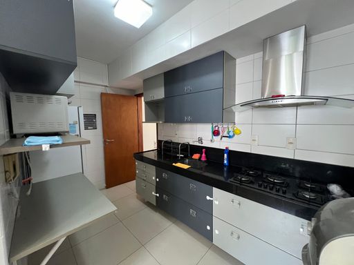 São 3 quartos, sendo 2 suítes (uma com closet) e mais um quarto de serviço, nascente e com excelente ventilação. O imóvel está **totalmente mobiliado, porteira fechada**, pronto para morar — com TV, ar-condicionado, mesa de jantar, sofá, camas, geladeira, fogão, coifa, máquina de lavar e muito mais.