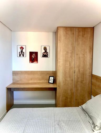 -Cama queen, escrivaninha, guarda-roupa.